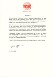 मैं पवित्र पिता पोप लियो द्वारा उनके पाम संडे मास के दौरान की गई शांति के लिए की गई शक्तिशाली अपील का तहे दिल से समर्थन करता हूं। हथियार डालने और हिंसा के त्याग का उनका आह्वान मेरे साथ गहराई से गूंज उठा, क्योंकि यह सभी प्रमुख धर्मों की शिक्षाओं के सार को बताता है।